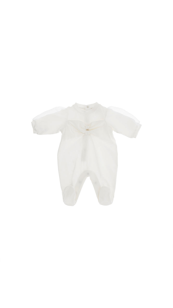 Questa tutina Papillon di Elisabetta Franchi per neonata è realizzata in Italia con felpa di alta qualità, garantendo comfort e morbidezza. Le maniche in organza aggiungono un tocco di raffinatezza, mentre il dettaglio del fiocco sul davanti e la targhetta con il logo impreziosiscono il capo con eleganza discreta.