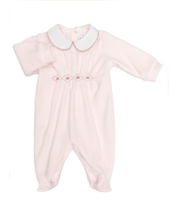 La tutina PERLINA, firmata BARCELLINO, è realizzata in ciniglia morbida e calda, perfetta per garantire comfort alla neonata. Il colletto alla Peter Pan presenta un delicato dettaglio di rose ricamate a mano, arricchite da piccole perline al centro, che conferiscono un’eleganza discreta. Adatta anche per l’uscita clinica, questa tutina unisce raffinatezza e praticità nei momenti più importanti.