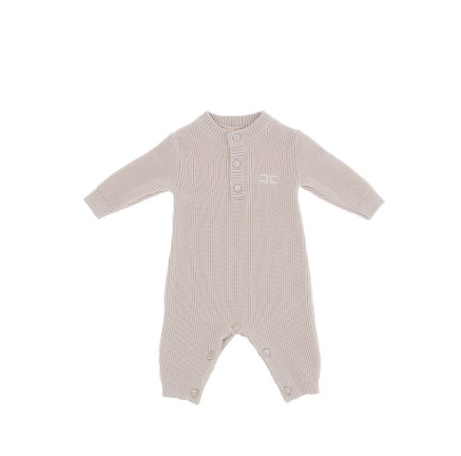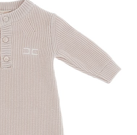 Questa tutina neonatale, creata da Elisabetta Franchi, è perfetta per l'uscita dalla clinica. Realizzata in maglia lavorata a mano con ferri, presenta un raffinato girocollo a coste e un’elegante abbottonatura serafino. Il logo doppia C ricamato al centro aggiunge un tocco distintivo di stile. Pratica e curata nei dettagli, è dotata di abbottonatura anche sul cavallo per facilitare il cambio, abbinandosi con classe al coordinato uscita clinica SKIN.